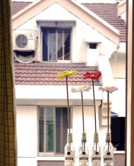窗前,沒有過多的裝飾,連窗套,也是簡單的一塊板,再刷上一層白漆。插花的瓶子是上回和朋友K歌時(shí),喝剩下的,覺得還漂亮,就帶回了家。四朵色彩太陽花,將白晝所有的喧嘩浮土都埋藏其中。不管窗外春夏秋冬,一切都是自然隨意的。