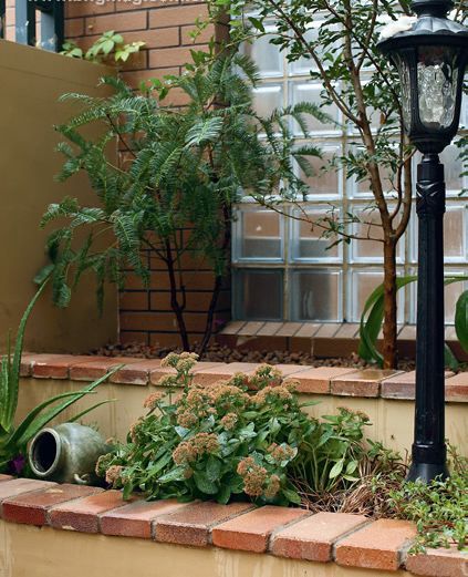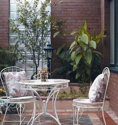 花園一端用玻璃墻作為隔斷,不僅解決了鄰里間的私密性,還保持了光線,裝飾感很強(qiáng)的鐵藝家具加一個(gè)靠墊就很舒適。