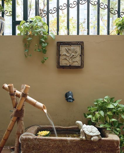 花園的另一端則設(shè)計(jì)了一處小巧的水景,石槽是設(shè)計(jì)師及小品配置師從石材市場(chǎng)淘來(lái)的,槽中種幾株鳳眼蓮,養(yǎng)兩條小魚(yú)(小魚(yú)還可以消滅水中蚊蟲(chóng)),加以竹管里的小小流水,給花園帶來(lái)動(dòng)感享受,在門(mén)前形成一道別致有趣的景觀。