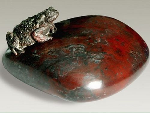 一塊深褐近黑的圓石,滿布滟紅欲滴的云狀血痕,其上一只石雕蟾蜍,躍動(dòng)著一股真切、強(qiáng)烈的生命力,讓你感慨、震顫、動(dòng)情。你仿佛聽得見它心靈的傾訴、低吟、歌唱。那雙深諳世事的眼球,仿佛在與人對(duì)望般,吸引觀者,感受那強(qiáng)烈的寓動(dòng)于靜的生命味道。