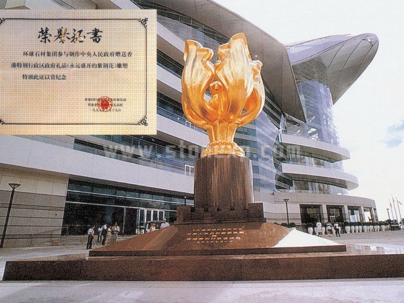 1997年香港回歸,受中央政府重托,環(huán)球石材集團承造贈香港特區(qū)政府禮品《永遠盛開的紫荊花》的“九州方圓”基座。3.5米高的紫荊花含苞待放、金光閃閃、雍容華貴,象征著生機勃勃的香港。朱紅色的“九州方圓”基座氣勢磅礴,猶如祖國母親溫暖而堅毅的懷抱保衛(wèi)著蓄勢待發(fā)的新香港。1997年7月1日,一尊巨型的紫荊花閃耀在香港維多利亞灣畔。這座高6米的雕塑就是中央人民政府贈送給香港特別行政區(qū)政府的回歸禮品。——《永遠盛開的紫荊花》,見證香港回歸盛世樂章。見證世紀盛典、承載民族希望,環(huán)球人用精典的工藝掀開了香港發(fā)展新的扉頁。 |