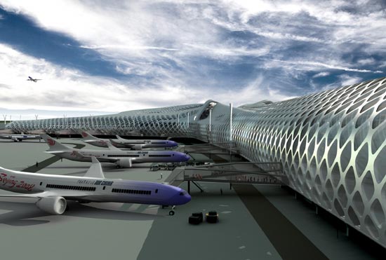 這是建筑師reiser 和 umemoto參與競標(biāo)深圳寶安國際機場新3號候機樓的設(shè)計方案,雖然最終他們的方案輸給了建筑師massimiliano和doriana fuksas的設(shè)計方案,但其創(chuàng)新的設(shè)計理念還是給評委們留下了深刻的印象,為自己贏得了贊譽。下面請大家欣賞一下這個設(shè)想中的宏偉建筑: