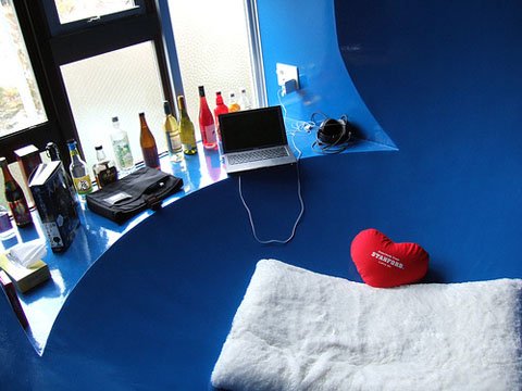 餐廳地板不規(guī)則地傾斜著,廚房是下陷的,書房則布以凹陷的地板。電源開關(guān)被安置在意想不到的地方,你要摸索著去感覺正確的位置才行。 通向陽臺的玻璃門太小了,人只能彎著腰爬過去。在這里還經(jīng)常失去平衡,找到平衡后,不知什么時候又會被絆到、跌倒。這里沒有櫥柜空間;居住者要自己找到生存下去的方法。