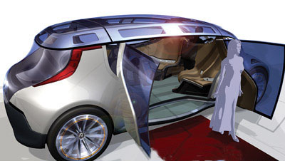 圖7:大眾奧迪加利福尼亞設(shè)計(jì)中心設(shè)計(jì)的“The Mobile Lounge”。采用燃料電池作為動(dòng)力,設(shè)想配備可通過(guò)電子裝置調(diào)節(jié)亮度的玻璃,可升降的車頂。側(cè)門的對(duì)面設(shè)計(jì)有抽屜,可作為儲(chǔ)物空間使用。設(shè)計(jì)人員的想法是“在高速公路堵車時(shí)也能輕松應(yīng)對(duì)”。