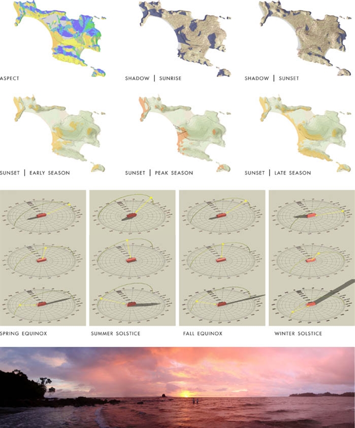 Developed in GIS, an ecozoning plan analyzes layers of environmental, social and economic conditions. However, it was multiple site visits with local environmental experts that provided the opportunity to investigate the island's spiritual quality. Each visit explored new parts of the island, offering the design team a fresh aspect. Interaction with the region's Ngobe-Bugle Indian tribe offered the team insight to cultural traditions, including patterns from their arts and crafts that influenced the project's architectural design. The design team drew upon these observations in order to develop a series of master plan conclusions related to coastal access, transportation, development, energy, open space and conservation. The coastal assessment identified two access points to the island. The deeper, north cove allows for a service marina, while the picturesque, east cove, welcomes guest arrival. Ridgelines are preserved and structures are nestled into the landscape to reduce visual impact. Development is concentrated on previously cleared areas along coastlines and facilitates passive ventilation. A centrally located service area, located on a flat area where the forest floor is relatively bare, is adequately screened. The island's fragile forests, lagoons and mangroves—