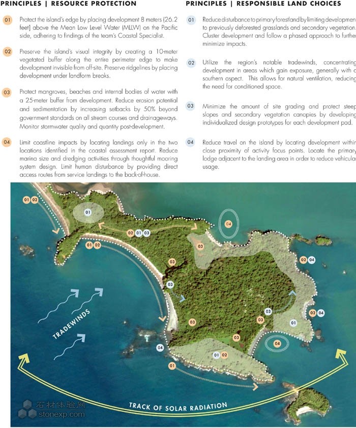 基于地理信息系統(tǒng)的發(fā)展,一項(xiàng)生態(tài)規(guī)劃計(jì)劃分析了這里多層次的環(huán)境、社會(huì)和經(jīng)濟(jì)條件。然而,是當(dāng)?shù)丨h(huán)境專家們對(duì)此地進(jìn)行的多次拜訪為考察這個(gè)島嶼的精神特質(zhì)提供了機(jī)會(huì)。每次考察都會(huì)發(fā)現(xiàn)該島嶼的一些新領(lǐng)域,為設(shè)計(jì)團(tuán)隊(duì)提供了一個(gè)全新的視角。與該地區(qū)Ngobe-bugle印第安部落的交流互動(dòng)為設(shè)計(jì)團(tuán)隊(duì)提供了對(duì)文化傳統(tǒng)的洞察力,包括他們的工藝品的圖案,這些都對(duì)該項(xiàng)目的建筑設(shè)計(jì)產(chǎn)生了影響。設(shè)計(jì)團(tuán)隊(duì)把觀察到的這些進(jìn)行了匯總,以便繪制一系列的最終藍(lán)圖,這些藍(lán)圖與沿海入口、交通、發(fā)展、能源、開(kāi)放空間和環(huán)境保護(hù)息息相關(guān)。對(duì)沿海的評(píng)估確定了兩條通往該島嶼的路徑。較深的北部海灣能夠容納一個(gè)服務(wù)用的碼頭,而風(fēng)景如畫的東部海灣可用來(lái)歡迎到來(lái)的游客。屋脊被予以保留,建筑隱藏于風(fēng)景之中以便減少視覺(jué)上的影響。該島嶼的發(fā)展重點(diǎn)是海岸線上之前的空白區(qū)域,以促進(jìn)被動(dòng)通風(fēng)。一個(gè)位于中心地帶的服務(wù)區(qū)被恰當(dāng)?shù)禺嫷搅似矫鎴D上,這個(gè)服務(wù)區(qū)坐落在一個(gè)平坦的區(qū)域,這里的森林地被非常貧瘠。該島嶼脆弱的森林、環(huán)礁湖和紅樹(shù)林——大概占該島的95%——被予以保留,成為公眾的一處自然避難所。
