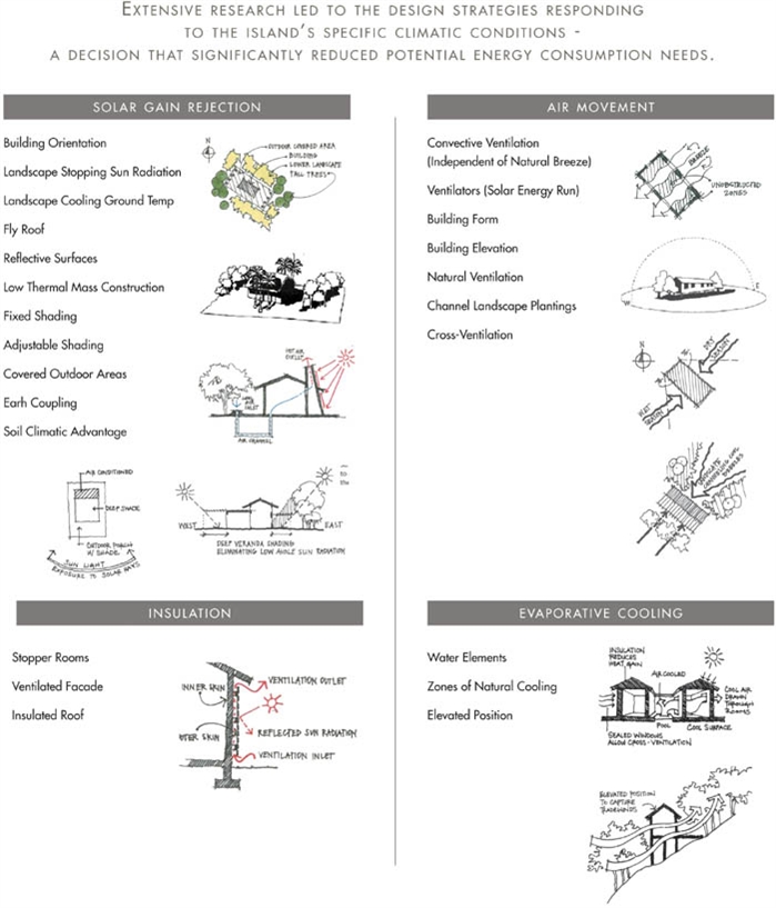 Collaboration between the landscape architect and design team resulted in bioclimatic strategies that utilize the island's tropical climate to reduce energy needs. Strategies revolve around air movement, insulation, solar gain rejection and evaporative cooling. Building orientations are balanced perpendicular to the prevailing winds of dry and wet seasons. Landscape enhancements channel breezes into buildings elevated off the ground, allowing cross ventilation. In tropical environments, the east and west aspects receive the strongest sun at the lowest angle. Therefore, the design team orientated the short sides of buildings in these directions, positioning landscape to further shade. Exterior planted terraces replace paving to reduce ground temperatures. Bodies of water are placed immediately outside openings to pre-cool air entering the house. Rainwater harvesting techniques, including collection cisterns and towers, are celebrated and incorporated into the architecture and later reused in the landscape.