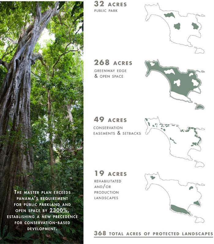 8 Conclusions from Analysis. Under current Panamanian law, 15 percent of the 66 developed acres [which equates to 16 acres] must be reserved for public parkland. The master plan doubles this requirement and goes beyond to preserve 336 additional acres in conservation.