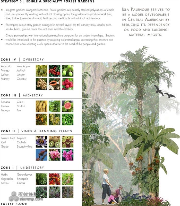 11 Enhancement of Living Zone. Recognizing the constraint and expense of importing building material and food, an extensive agrotourism program identifies opportunities for edible forest gardens. Gardens aim to foster educational development to three user groups: local Chiriquí citizens, island guests and international permaculture programs.