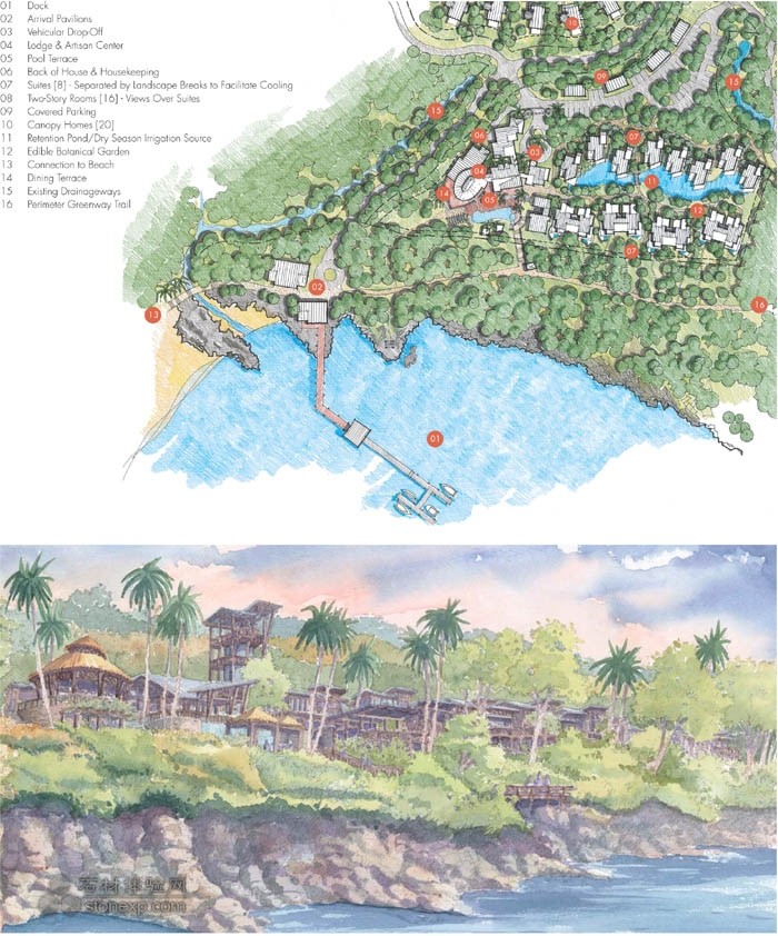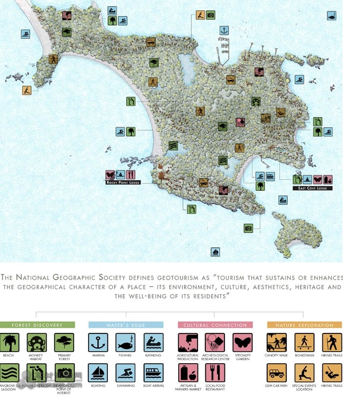 島嶼在我們大家的潛意識(shí)里是一個(gè)非常特別的地方,集神秘、發(fā)現(xiàn)、孤獨(dú)于一身,偶爾還帶有危險(xiǎn)性。大陸上是普通人生活的地方,但是島嶼非常特別?;蛟S是這些內(nèi)在的特性激發(fā)了客戶,讓他們敢于采取行動(dòng)來(lái)實(shí)現(xiàn)自己大學(xué)時(shí)代就已經(jīng)孕育的夢(mèng)想。巴拉馬成為客戶的第一個(gè)地質(zhì)旅游項(xiàng)目,其目的是為可持續(xù)的島嶼發(fā)展樹(shù)立一個(gè)模板,以期能表現(xiàn)出該地區(qū)的真正精神。由于整個(gè)中美洲實(shí)行的松散的發(fā)展規(guī)劃,很多原始遺址極易受到破壞,淪為森林砍伐、毫無(wú)節(jié)制的發(fā)展和傳統(tǒng)的人造娛樂(lè)活動(dòng)的犧牲品,所有這一切都對(duì)環(huán)境造成了不良影響。園林設(shè)計(jì)師可以通過(guò)整合可持續(xù)性、生態(tài)旅游、環(huán)境保護(hù)和教育等方面來(lái)幫助客戶實(shí)現(xiàn)他的夢(mèng)想。這一項(xiàng)目遠(yuǎn)不止是為了生態(tài)旅游。美國(guó)國(guó)家地理協(xié)會(huì)給地質(zhì)旅游下的定義是“能夠維護(hù)或者增強(qiáng)一個(gè)地方的地理特征——它的環(huán)境、文化、美學(xué)、遺產(chǎn)以及其居民的康樂(lè)的旅游”。像生態(tài)旅游一樣,地質(zhì)旅游能夠促進(jìn)一個(gè)良性循環(huán),借此,旅游的收益可以用來(lái)激勵(lì)當(dāng)?shù)厝吮Wo(hù)游客們想來(lái)看的東西,但同時(shí)也擴(kuò)展了超越自然和生態(tài)的原則,以便來(lái)綜合各種能夠提供地域感的特征比如歷史建筑、生活和傳統(tǒng)文化、風(fēng)景、烹飪、藝術(shù)和工匠以及當(dāng)?shù)氐膭?dòng)植物。