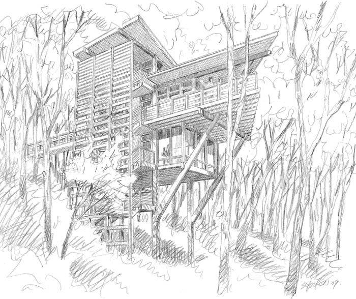 在該島的民用小屋的規(guī)劃過(guò)程中,巴拿馬的建筑遺產(chǎn)被發(fā)揮到了極致。這些房子模仿附近村子的形式,被設(shè)計(jì)成了較小的建筑群。這些小屋是由模塊化的部分構(gòu)成的,它們能夠被重新安排以便保護(hù)那些著名的樹(shù)木。村落式的設(shè)計(jì)使得建筑式樣能夠跟上檔次,所有的房間都面向庭院敞開(kāi)。陡峭的斜坡和高大的穹廬般的森林需要開(kāi)發(fā)一種住宅替代品。由一系列吊起來(lái)的木板路連接起來(lái)的地勢(shì)較高的蒼穹式房屋可以保存現(xiàn)存的等級(jí)和植被。從頂層可以觀看到海邊的景色,因?yàn)榻ㄖ锝咏n穹。倒置的屋頂收集并把水轉(zhuǎn)移到蓄水池里。