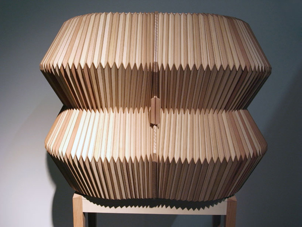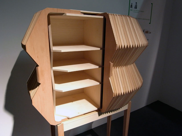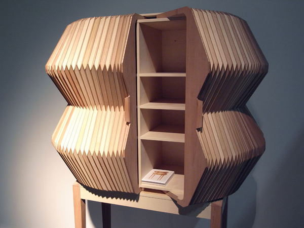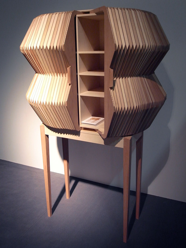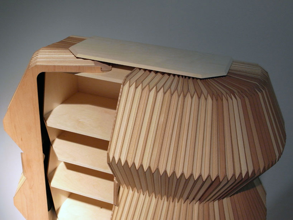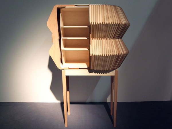 這件儲藏柜外部的薄木片層像手風琴一樣被折疊起來。用激光切割的木片手工固定在一個織物(比如萊卡布料)表面上。這兩種材料的巧妙結(jié)合,讓木片表面像布料一樣柔軟有彈性。手風琴一樣的表皮將矩形的柜子包裹起來,不用的時候它就像門一樣可以關閉。