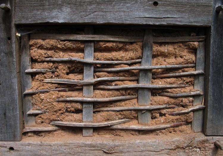 據(jù)介紹,除木質(zhì)桁架結(jié)構(gòu)外,大面積的桁架空間,填充泥坯。小面積的是用葡萄枝編織的芭,然后涂上含有草,或麻筋的泥。