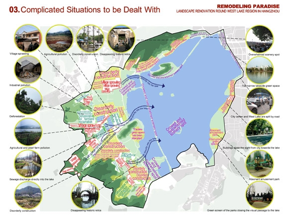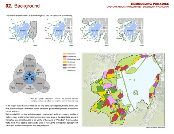 杭州的西湖是中國文化中最重要的天然湖泊。 1000多年以來,人們在西湖創(chuàng)造了優(yōu)美的風景和豐富的歷史遺跡,以及一個廣為流傳的傳說,還有很多的詩歌和其他文化遺跡。 西湖一直是中國傳統(tǒng)景觀,甚至是其他亞洲國家景觀的理想模式。 由于西湖,杭州被稱為人間“天堂。”到了20世紀末,迅速增長的游客數量以及城市化進程,許多問題已變得越來越尖銳了。杭州,包括西湖地區(qū),也無法成為“名副其實的天堂”。 在這種情況下,該項目于2001年提出。 當地政府期望創(chuàng)造一個更好的城市環(huán)境,促進旅游業(yè)的發(fā)展,并提高西湖作為城市公共空間的品質。該項目占地12.8平方公里,幾乎包含杭州城所有的重要景觀資源。由于這是一個極其復雜的大型系統(tǒng)工程,景觀建筑師面臨多重挑戰(zhàn)。