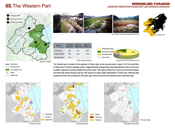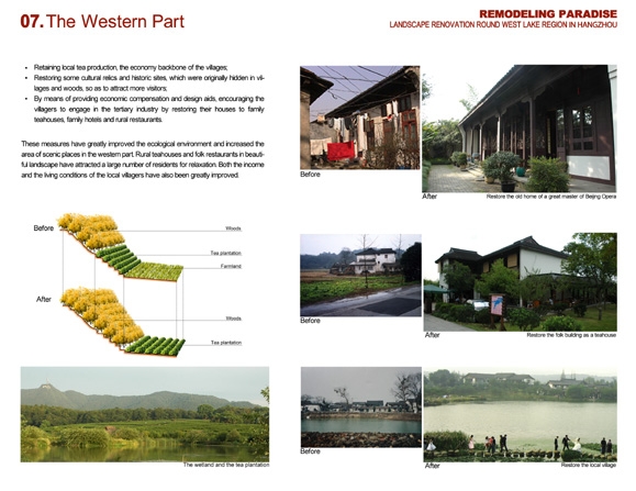 西側位于西湖上游。因為缺乏排水系統(tǒng),農村的生活污水直接排放到西湖里,此外,農業(yè)活動也在污染著地表水。 這個地區(qū)遭受了嚴重的環(huán)境污染,那些骯臟的河流流入進西湖,是導致西湖水質下降的主要原因。 歷史數據顯示,這里200年以前還是湖區(qū),現在都被開墾成為農田和魚塘了。 整治措施建議包括:(1)建立污水處理系統(tǒng);(2)轉化大多數農田,魚塘為濕地,林地,荒地。為保護西湖水源,凈化水質;(3)保留本地茶葉生產,回復村莊的核心經濟;(4)提供經濟補償和輔助設計手段,鼓勵村民從事第三產業(yè),恢復一些老建筑來做成家庭茶館,家庭旅館或鄉(xiāng)村餐館。 這些措施極大地改善了生態(tài)環(huán)境,增加了在西部地區(qū)部分風景名勝區(qū)。 一些文物和歷史遺跡,原本隱藏在村莊和樹林中,整修后吸引了大量游客。 農家樂和美麗的風景,吸引了大批城市居民前來放松。農民的收入和生活條件被大大改善。