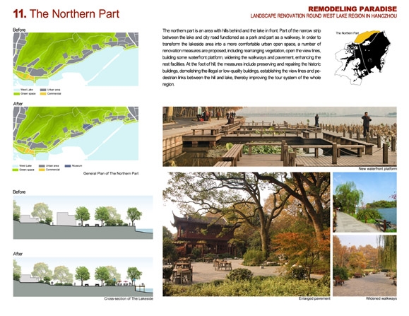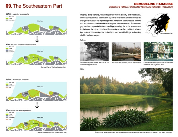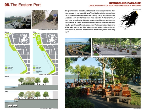 杭州被譽為是中國“人間天堂”,自2001年起的大規(guī)模更新工程已經規(guī)劃改造完畢。面臨多重挑戰(zhàn),設計師們因地制宜紛紛提出不同解決方案。此項目的完成明顯改善了周邊環(huán)境,刺激了當地旅游事業(yè)的發(fā)展,提供了高質量的城市開放空間,從而促進了城市的可持續(xù)發(fā)展。