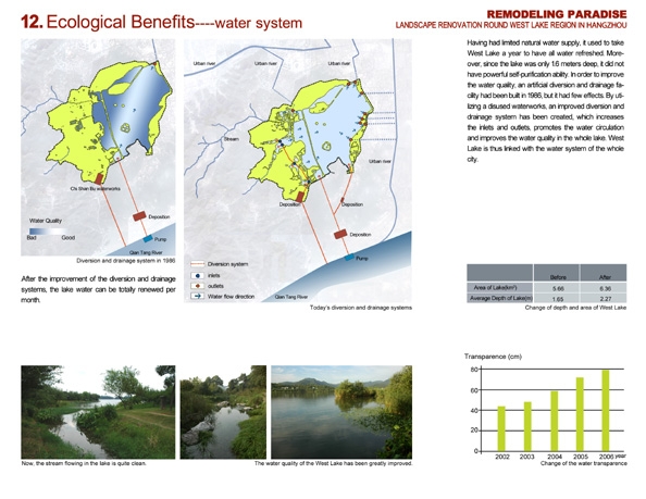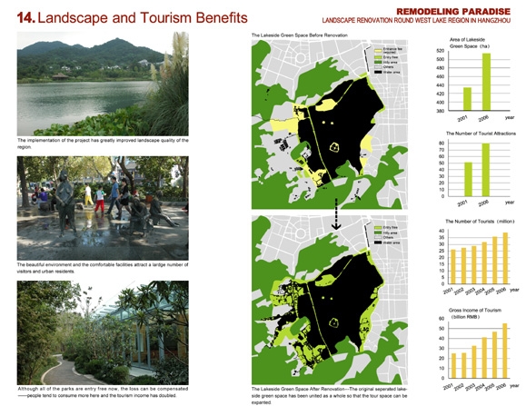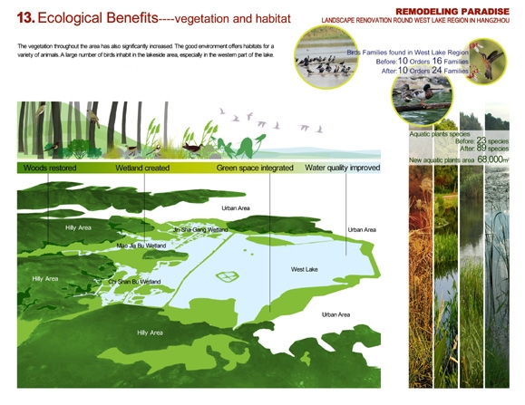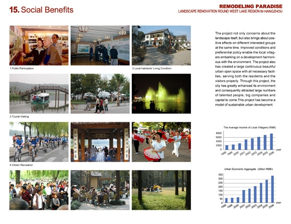 該項目不僅對景觀改善,也對其它的利益集團有正面影響。 改善條件和優(yōu)惠的政策,使當地村民在和諧環(huán)境中開始發(fā)展。 該項目還創(chuàng)造了這個美麗的城市所需要的一切大型景觀設施,同時為居民和游客提供正常的開放空間。 據調查,從2005年至2009年,杭州連續(xù)5年榮獲中國最佳城市稱號。