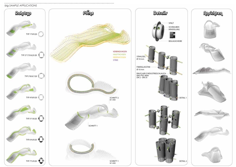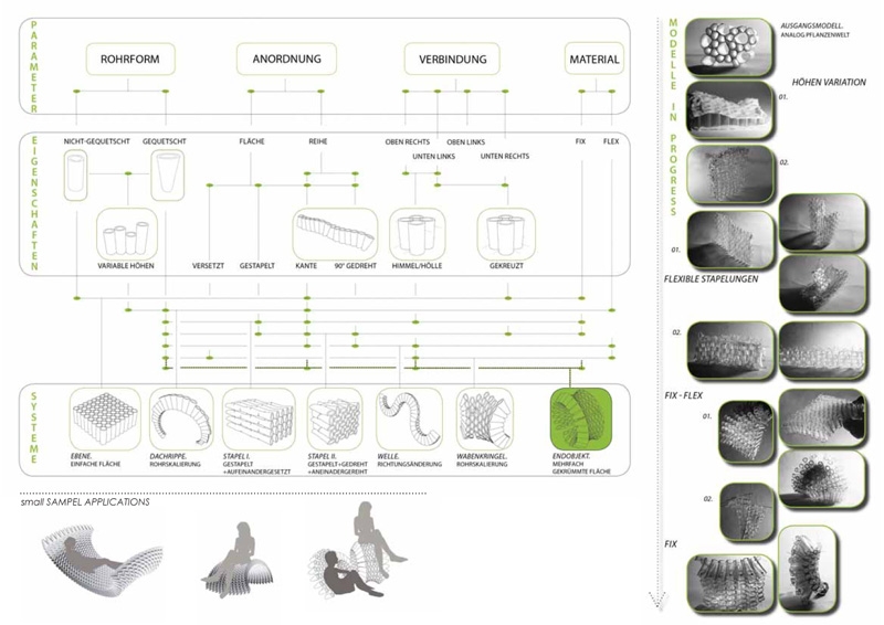 并實際的用塑料管做了實驗,每一個單元與其它單元的連接,單元所帶的幾何屬性可以創(chuàng)造出靈活,彎曲,穩(wěn)定的表面。材料的性質(zhì)使得關(guān)聯(lián)處充滿了張力,以創(chuàng)造形態(tài)。(材料關(guān)聯(lián)處能在幾個方向上進行改變,同時依然穩(wěn)定。固定—彎曲)通過改變參數(shù),證明了這一概念的多樣性。