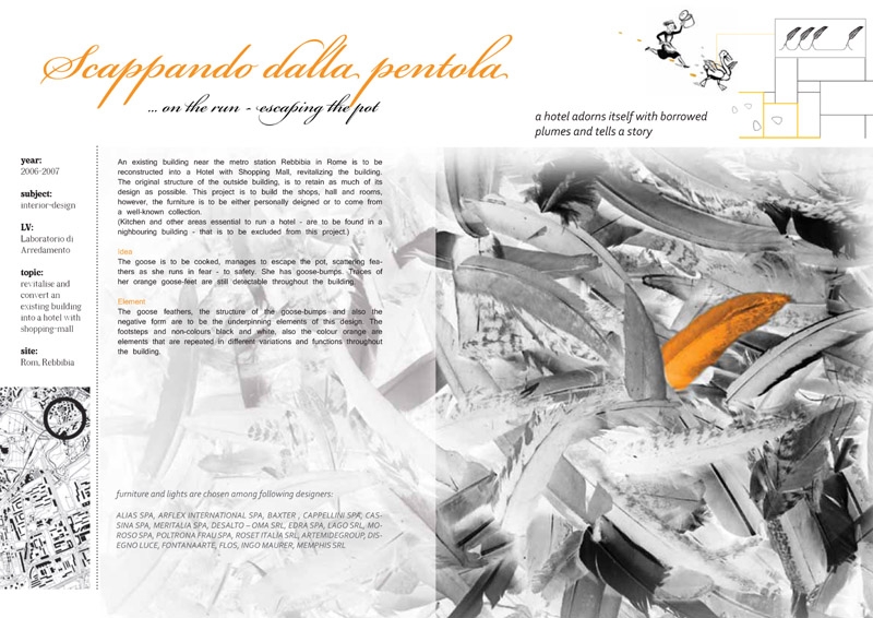 羅馬Rebbibia 地鐵站附近的建筑將被改建成一個集購物的大酒店。盡可能的多保留要有建筑風貌。項目要求設立商店,大廳,客房,甚至里面的家具都有親自選擇,組成一個明了的整體。(廚房和其它功能的設計體現(xiàn),在這個項目中未被要求考慮)