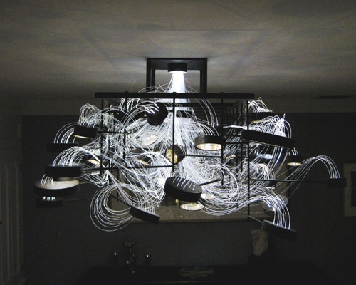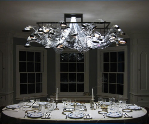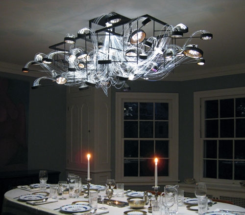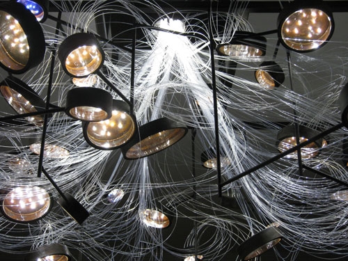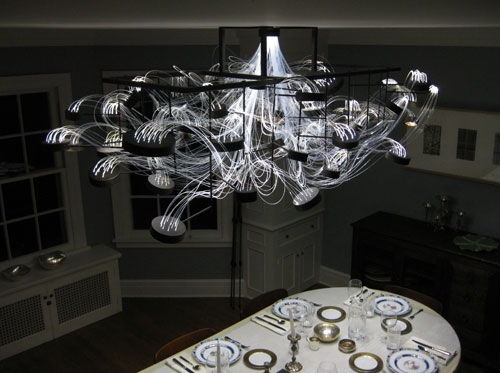 因此,這款由15000英尺長的光學(xué)纖維,加鐵棍,加一些圓形培養(yǎng)皿共同組成的吊燈,還真的在培養(yǎng)皿里面放了每個家庭成員的一些“細菌”進去。
