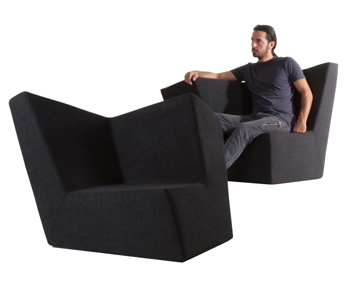 With its multi-angled surfaces intersecting in three dimensions the form of the Black Diamond armchair embodies a dynamic sculpture. The general shape of the seating furniture seems to be torn out of a larger mass – whereas several side-by-side armchairs produce different formal perceptions. The user plays an active role in this change of form and style of usage. When the armchair is rotated at its outer edges the three surfaces in the centre create two different seating positions, an upright and an inclined one.