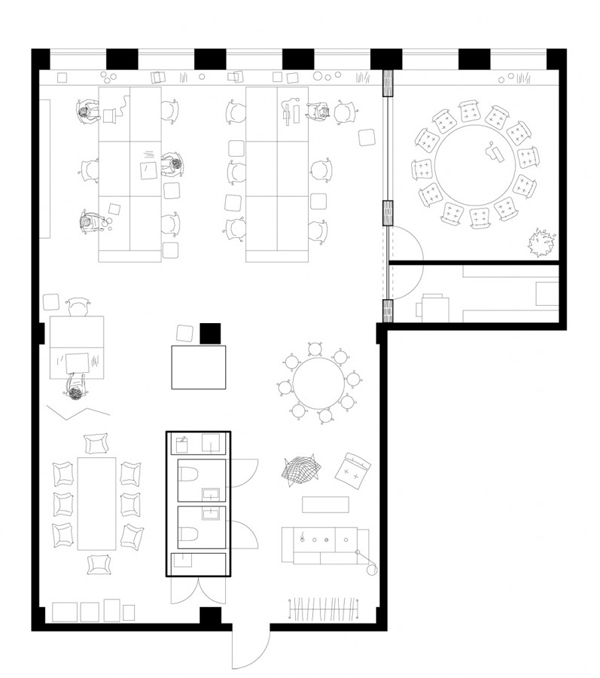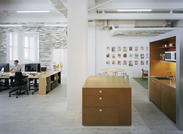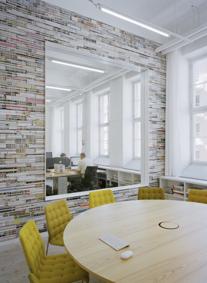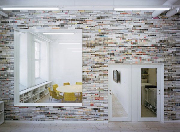 這套非常棒的設(shè)計是由國外Elding Oscarson 團隊制作的,靈感來源于將數(shù)千本雜志堆列成一堵墻,在視覺上給人駁雜但統(tǒng)一的感覺,配一簡潔的大廳環(huán)境,很好的分割了空間和增加趣味性。