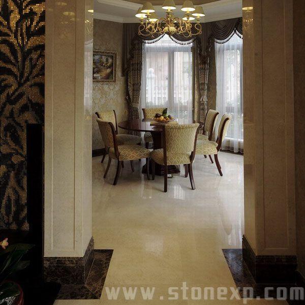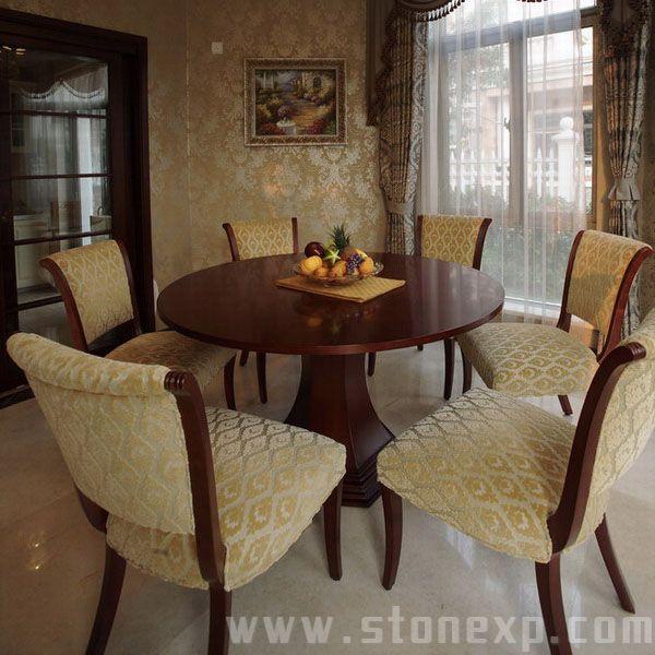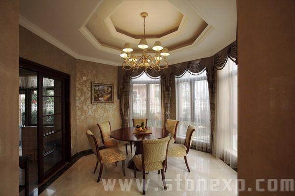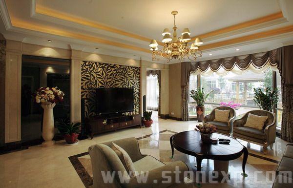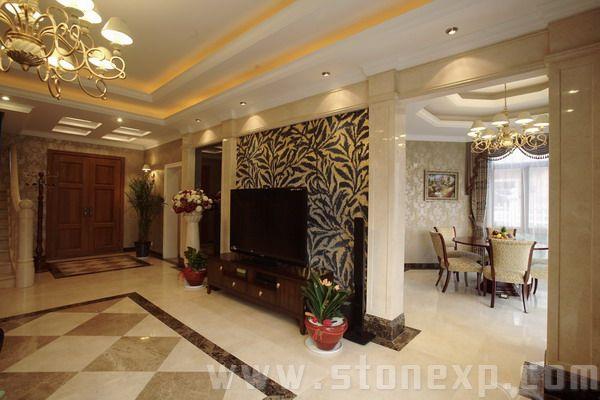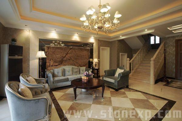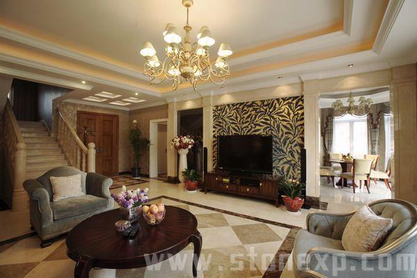 運用絨布沙發(fā)和銀邊勾勒出美妙的線條,用灰鏡作呼應(yīng)。雨林棕的石材通過酸洗處理更加具有滄桑粗獷感,把整個石材的細膩、玻璃的亮麗、不銹鋼的高檔、墻紙的典雅襯托得淋漓盡致,高貴而時尚的Artdeco。