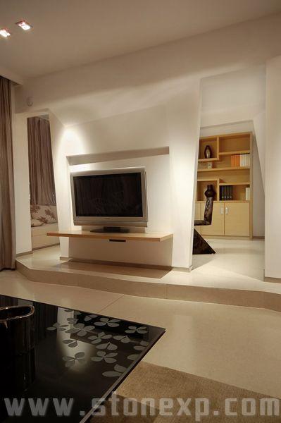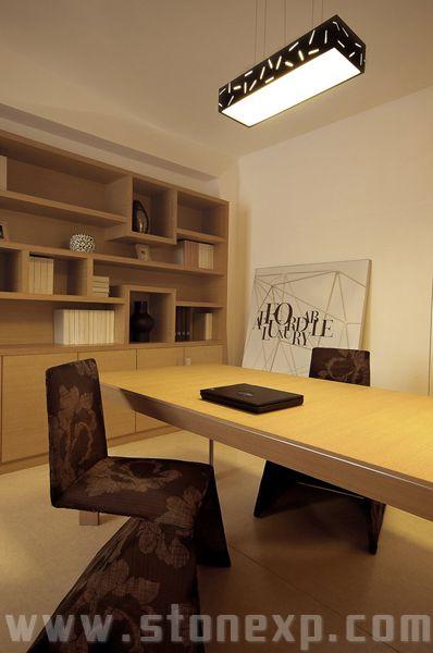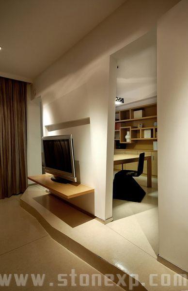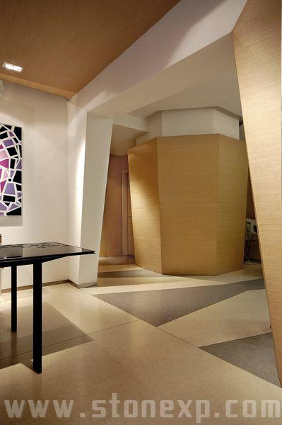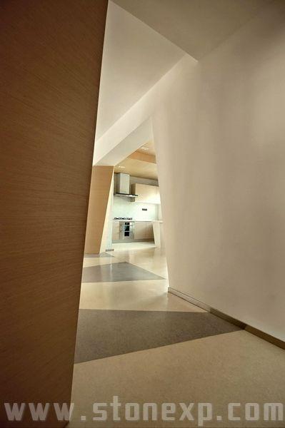 空間布局上,把客房變成餐廳,形成與廚房一體化的空間,連通書房與客廳以適應(yīng)高知人群對閱讀的極大需求,并利用較大的過道為主臥增加一個功能強大的衣帽間,這也為轉(zhuǎn)折延綿的形體提供了舞蹈的場所。從地面到墻面、從墻面到頂面,都運用統(tǒng)一和諧又活潑多變的幾何類鉆石轉(zhuǎn)折面的表皮來表現(xiàn)一種幾何空間美學(xué)概念。表皮的形式豐富多樣,主要以三角幾何形體和類似鉆石轉(zhuǎn)折面形體組成,轉(zhuǎn)折蜿蜒,特有的比例和尺度感,不規(guī)則中透出對設(shè)計的求新,而又不會影響習(xí)慣上對空間的認知。在如此轉(zhuǎn)折變化的空間中,功能一個也不能少,包含了從鞋柜到櫥柜、書柜、餐柜、衣柜、等等所有功能需求,實用體由轉(zhuǎn)折的“表皮”包裹起來,形式與功能統(tǒng)一,解決了形式與功能的爭議。