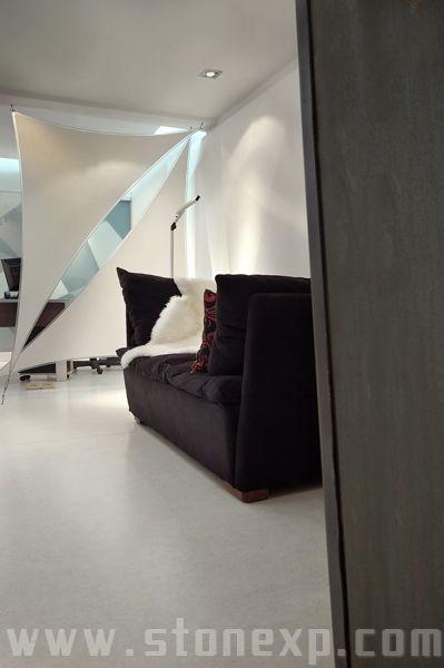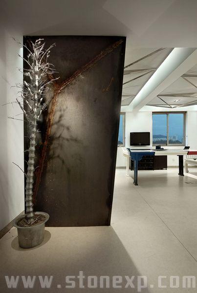 大玻璃門表面用自由轉折磨砂,半透不透卻更加吸引著視線。門廳的銹蝕鋼板玄關,刻意壓制入口的視覺,把銀粉噴涂的羅漢竹映襯得更具有生命力。一轉眼,色調(diào)跳躍起來,純白的轉折并不太凸出,為的是留出更多的可用空間,轉折塊面若有若無的在立面上蜿蜒,頂部的鋼構也積極呼應,構成空間中后現(xiàn)代的基調(diào)。
