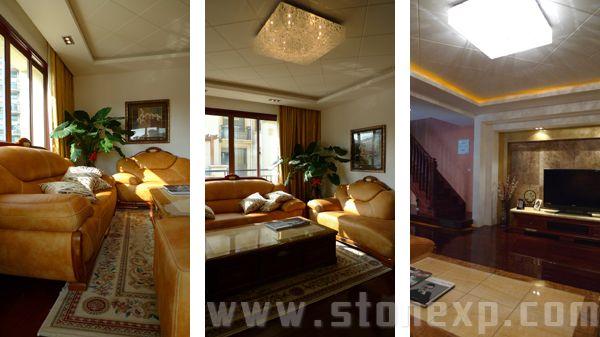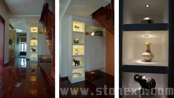 電視背景上方原來有樓上衛(wèi)生間的下水管,背景這樣處理很好的掩蓋了管道,同時又比較大方。干掛的石材體現(xiàn)了品質(zhì)生活的質(zhì)感。頂面為石膏板抽45度V型槽處理,優(yōu)雅漂亮!樓梯肚下的儲藏柜絲毫不顯得呆板,混水白色和兼做裝飾柜的處理,讓儲藏功能“一筆帶過”。