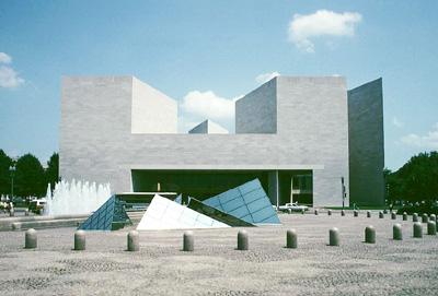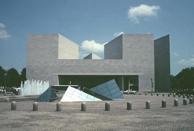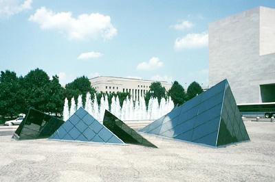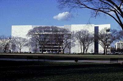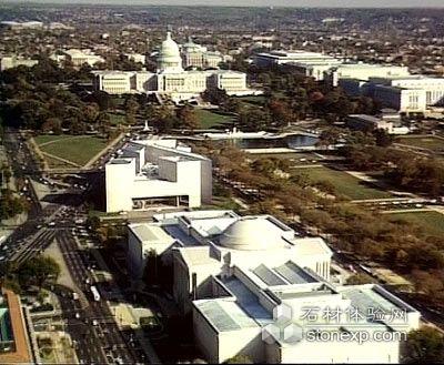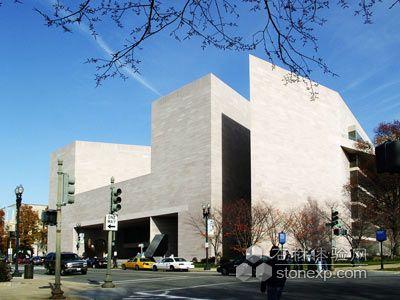 「東館」的地理位置十分顯要。它東望國會大廈,西望白宮。而它所占有的地形卻是使建筑師們頗難處理的不規(guī)則四邊形。為了使這座建筑物能夠同周圍環(huán)境構(gòu)成高度諧調(diào)的景色,貝聿銘精心構(gòu)思,創(chuàng)造性地把不同高度,不同形狀的平臺、樓梯、斜坡和廊柱交錯相連,給人以變幻莫測的感覺。