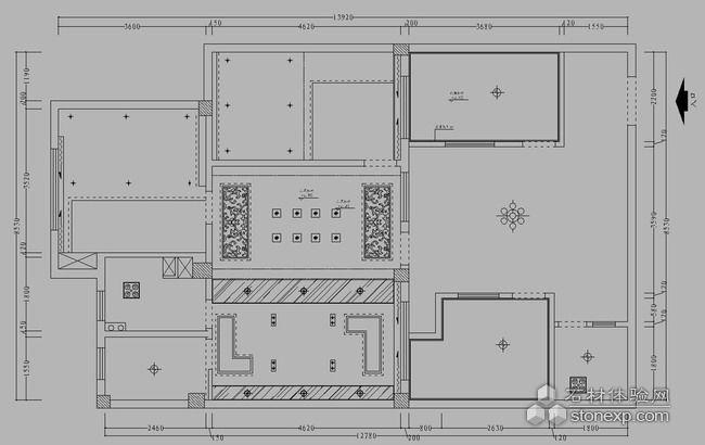 本案是一套二手房改造,從進(jìn)花園進(jìn)門把原在中間入戶門改靠邊,進(jìn)門的對(duì)景臺(tái)采用大理石立體雕花,在結(jié)合地面的大理石拼花。然后在花園的兩邊多加兩個(gè)小房間做為工人房和客房之用。