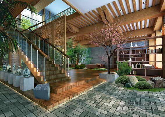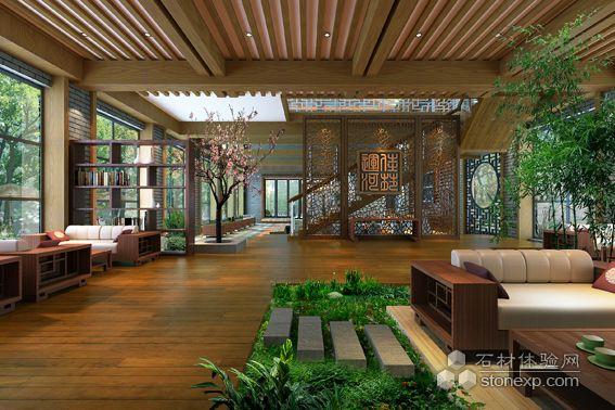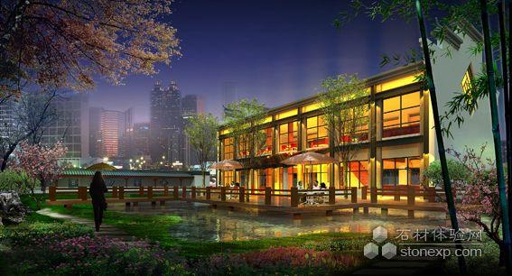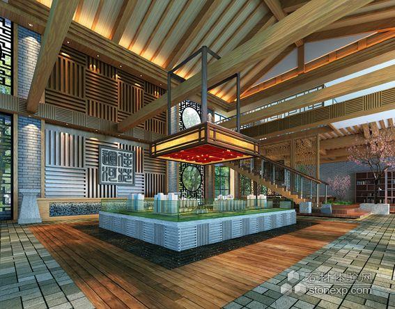 建筑外觀以中國古建筑為影子,山水、花木自然和諧地揉和在一起,徜徉其中,可得到心靈的陶冶和美的享受。建筑物架空較高,設計師在梁和天花的處理上運用了大量原木,既體現了中式建筑的穩(wěn)重大氣,又具時代氣息,在環(huán)保上也有一定考慮。地面以青石磚、木地板搭配使用,讓人耳目一新,很好的杜絕了空間的呆板。門窗上一改傳統中式格柵窗,以玻璃窗為主,在局部穿插進中式元素的代表,配合恰到好處。自然的植物搬進室內,在這個濃縮的自然界,“一勺代水,一拳代山”,相信設計師對中國文化與現代文明有很深的領悟才會有這套作品的誕生。