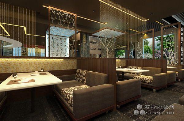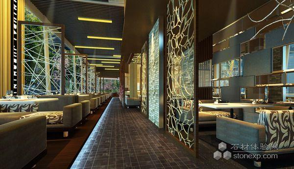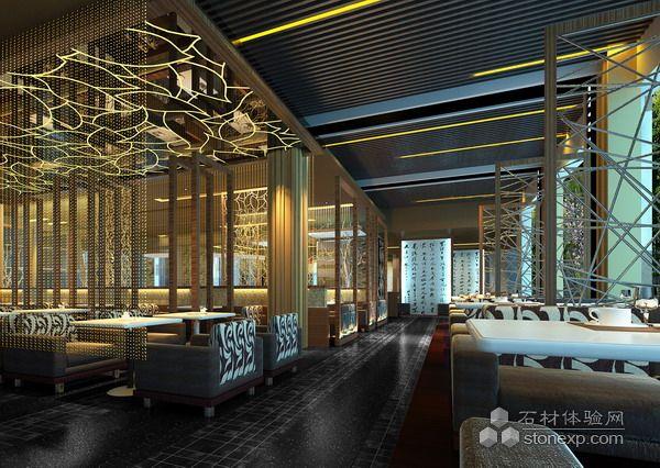 深色的拼花地面,黑色的清玻樹(shù)葉造型天花,體現(xiàn)餐廳的大氣、穩(wěn)重;妖嬈的玫紅色紗幔,淡黃的水晶吊簾,別致的鐵藝縷空隔斷,卡座間的金屬拉絲隔斷造型,給人強(qiáng)烈的視覺(jué)沖擊,卻毫無(wú)唐突之感,亦內(nèi)亦外,互為景致,中國(guó)園林的借景手法暗中體現(xiàn)。