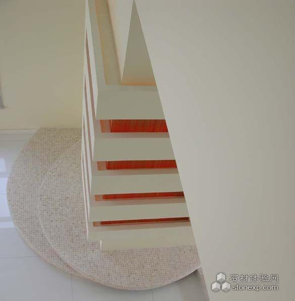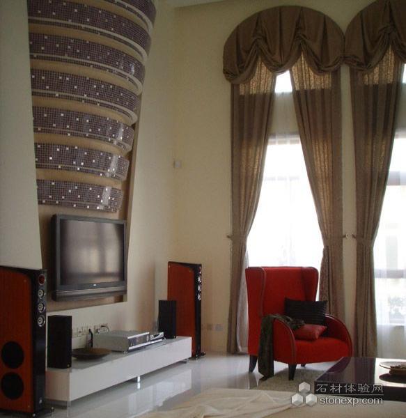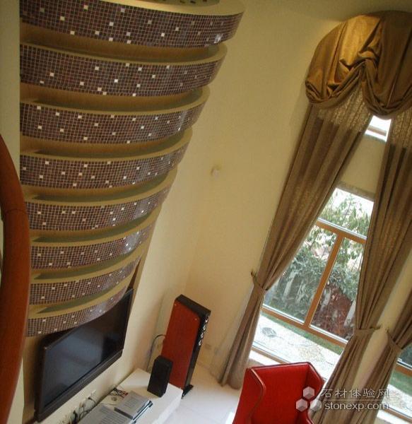 做為首層空間的空間表現(xiàn)的高潮所在出現(xiàn)在首層主客廳:以馬塞克為裝飾面而出現(xiàn)的極具力度的由大而小的弧型條狀整體造型,成為首層空間之中直線與弧線交融的最后終結(jié)點,輔以大廳頂部順向的弧線、二層弧型的挑空觀賞臺以及客廳相應的家具陳設品,毫無疑問,在客廳中心區(qū),高潮出現(xiàn)了……這又歸功于由門廳到門廳與客廳空間過渡區(qū)等的空間表現(xiàn)的前期鋪墊。做為空間個性的延續(xù), 色彩極其質(zhì)感的運用至關重要。