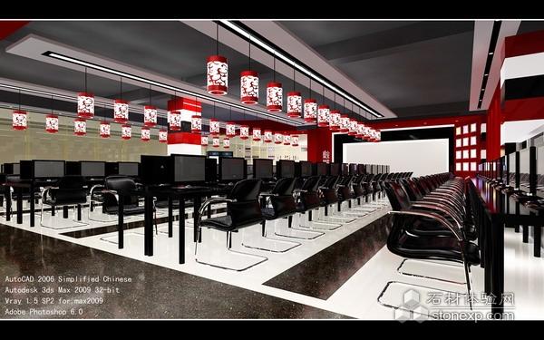 盛安網(wǎng)苑座落在美麗的濱海之城大連開發(fā)區(qū)安盛廣場(chǎng)五樓。為開發(fā)區(qū)最大,最有規(guī)模的網(wǎng)吧,在網(wǎng)吧生意日以下落的今日。老板決定對(duì)網(wǎng)吧進(jìn)行翻新改造,我考察了網(wǎng)吧現(xiàn)有的裝修風(fēng)格以及周遍的店面,決定對(duì)網(wǎng)吧采用黑,白,紅三色的響亮對(duì)比以此點(diǎn)燃網(wǎng)吧的熱列的效果,原頂面的黑色并沒有動(dòng),在此基礎(chǔ)之上,我把原來(lái)雜亂無(wú)章的頂改為一個(gè)方向的直線長(zhǎng)吊頂,白色吊頂?shù)闹虚g刷黑色漆,并加上白色筒燈,以次來(lái)增加視覺的沖擊力,為了隔開兩個(gè)區(qū)域的劃分,在走道處為紅色的頂面配以白色玻璃內(nèi)置燈管,同時(shí)也點(diǎn)亮了顧客的指引之路,顧客會(huì)順著這條燈帶的指引走到里面的衛(wèi)生間,所有的墻面全部采用紅色真石漆噴涂,柱子全部為黑色烤漆玻璃,接待臺(tái)為黑白玻璃搭配,白色玻璃的位置用來(lái)擺放冷藏柜,這樣冷藏柜就被隱藏了起來(lái),也不影響接待臺(tái)的整體性,食品與禮品架采用方格子透明玻璃并打上藍(lán)色與黃色的燈光,因?yàn)閺耐饷媛愤^的商場(chǎng)路人可以很直觀的觀賞到網(wǎng)吧的禮品架擺放的禮品,以次來(lái)吸引顧客的眼球,網(wǎng)吧的門頭采用紅白兩色玻璃構(gòu)成,配以黑色字體,白色玻璃內(nèi)置燈管,可以強(qiáng)烈的照明整個(gè)門前的區(qū)域,讓商場(chǎng)的對(duì)面和周圍的人們都可以把目光透向這里,從而達(dá)到吸引顧客的目的。