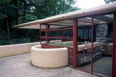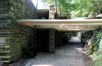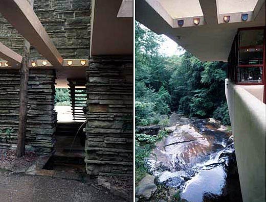 “流水別墅”這個(gè)建筑具有活生生的、超越時(shí)間的質(zhì)地,為了越過(guò)建筑史的諸多流派,它似乎全身飛躍而起,座落于賓夕法尼亞的巖崖之中,指揮著整個(gè)山谷,超凡脫俗。建筑內(nèi)的壁爐是以暴露的自然山巖砌成的,瀑布所形成的雄偉的外部空間使落水山莊更為完美,在這兒,自然和人悠然共存,呈現(xiàn)了天人合一的最高境界。特別值得注意的是,瀑布上的大平臺(tái)連帶1/3的起居室都飛挑于瀑布之上,對(duì)于當(dāng)時(shí)的工程技術(shù)而言,無(wú)疑是一大創(chuàng)舉。