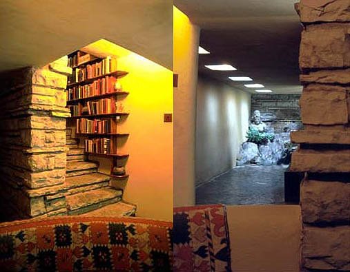 建筑的外形顯得自然、隨意、舒展,主要房間與室外的陽(yáng)臺(tái)、平臺(tái)以及道路,相互交織在一起,錯(cuò)落有致,亦取得與周?chē)匀痪吧嗳芎系男Ч?。建筑材料主要用白色的混凝土和栗色毛石。水平向的白色混凝土平臺(tái)與自然的巖石相呼應(yīng),而栗色的毛石就是從周?chē)搅炙鸭鴣?lái)的,有著“與生俱來(lái)”、自然質(zhì)樸和野趣的意味。不同凡響的室內(nèi)使人猶如進(jìn)入一個(gè)夢(mèng)境,通往巨大的起居室空間之過(guò)程,正如經(jīng)常出現(xiàn)在賴(lài)特作品的特色一樣,必然先通一段狹小而昏暗的有頂蓋的門(mén)廊,然后進(jìn)入反方向上的主樓梯透過(guò)那些粗獷而透孔的石壁,右手邊是直交通的空間,而左手便可進(jìn)入起居的二層踏步。萊特對(duì)自然光線的巧妙掌握,使內(nèi)部空間仿佛充滿了盎然生機(jī),光線流動(dòng)于起居的東、南、西三側(cè),最明亮的部分光線從天窗瀉下,一直通往建筑物下方溪流崖隘的樓梯,東、西、北側(cè)幾呈圍合狀的室,則相形之下較暗,巖石鋪成的地板上,隱約出現(xiàn)它們的倒影,流瀑在起居室空間之中,而從北側(cè)及山崖上反射在樓梯上的光線顯得朦朧柔美。在心理上,這個(gè)起居室空間的氣氛,隨著光線的明度變化,而顯現(xiàn)多樣的風(fēng)采。