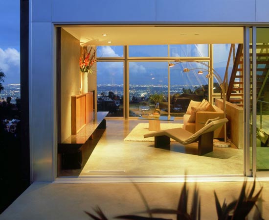 棟別墅由Ehrlich設計建造,坐落在位于海拔4000米的洛杉磯好萊塢山的一峽谷上,與山脈成45度角。面向峽谷的一面由鋼鐵架構(gòu)支持大面積的玻璃墻,以便一覽峽谷風光。